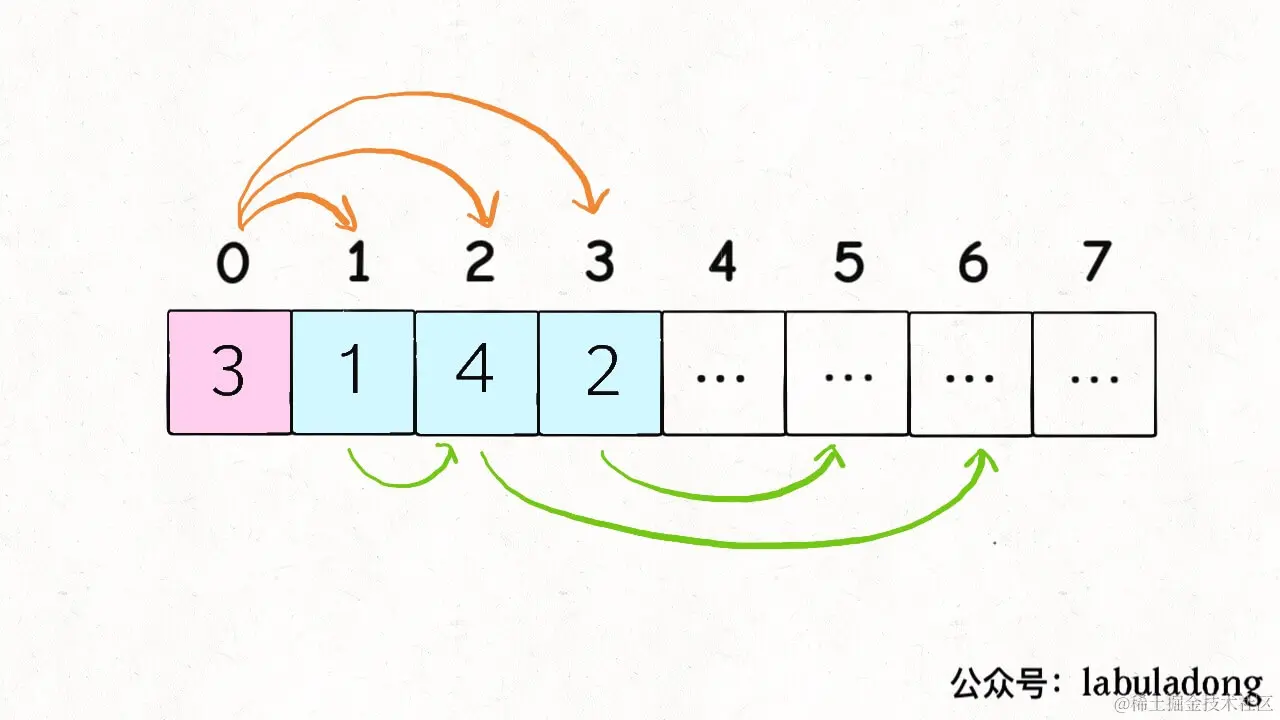 比如上图这种情况,我们站在索引 0 的位置,可以向前跳 1,2 或 3 步,你说应该选择跳多少呢?