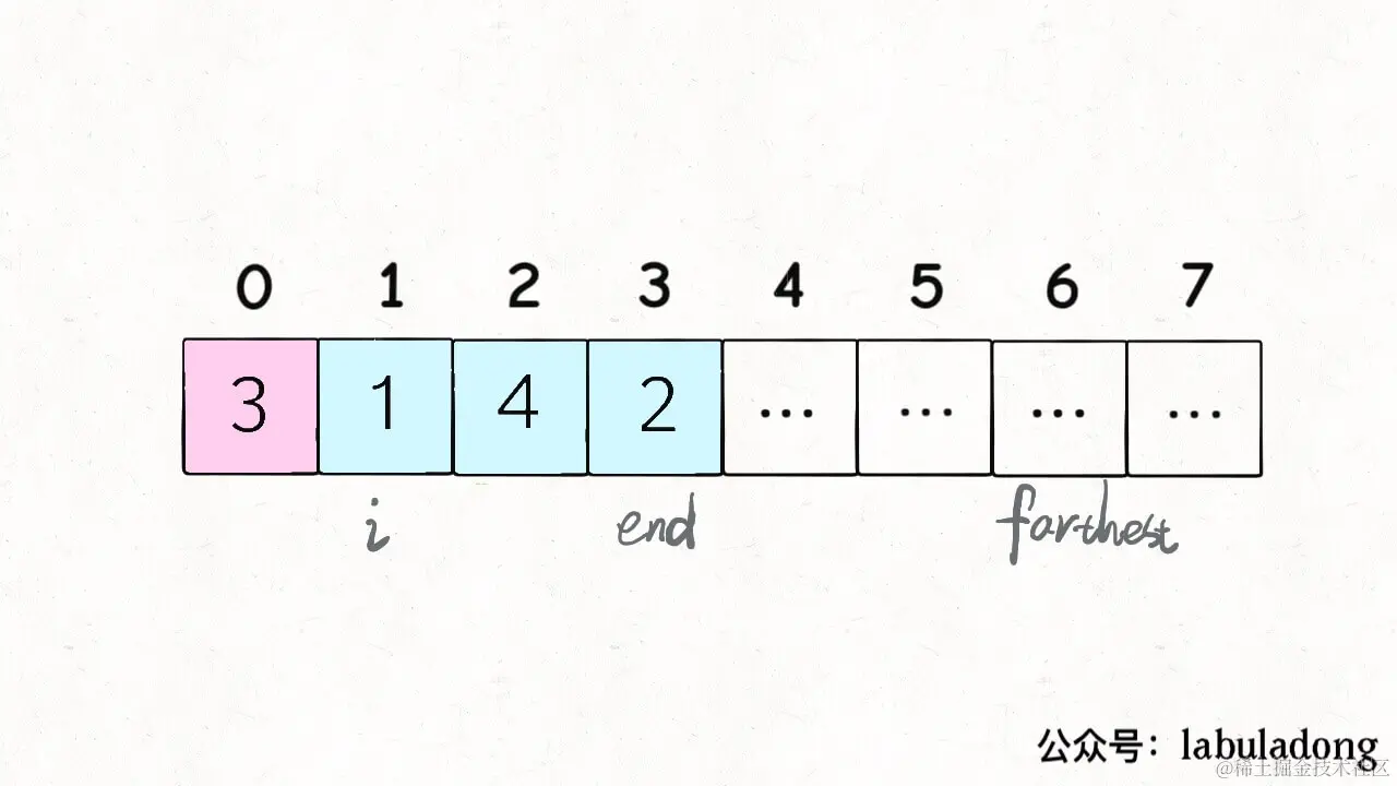 i 和 end 标记了可以选择的跳跃步数,farthest 标记了所有选择 [i..end] 中能够跳到的最远距离,jumps 记录了跳跃次数。