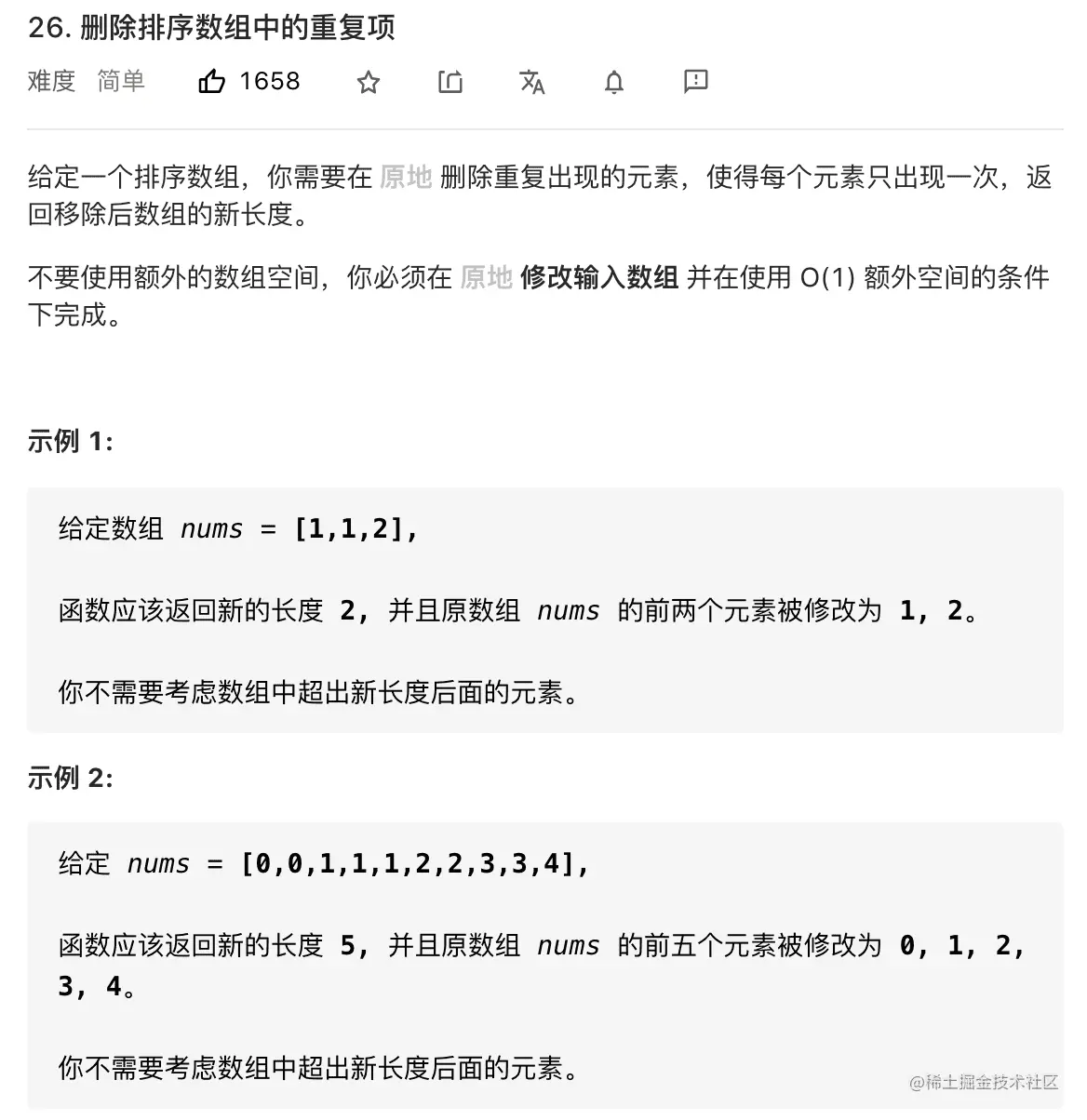 但是原地删除,不允许我们 new 新数组,只能在原数组上操作,然后返回一个长度,这样就可以通过返回的长度和原始数组得到我们去重后的元素有哪些了。