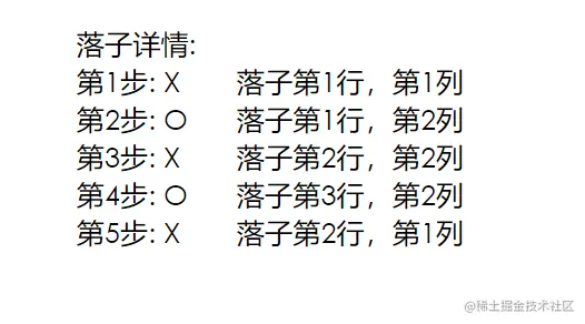 完成前面内容的都知道九个格子是可以用0-8作为下标index的,那这个需求就简单了,只要把下标简单换成横纵坐标,比如const arr = [[1, 1], [1, 2], [1, 3], [2, 1], [2, 2], [2, 3], [3, 1], [3, 2], [3, 3]]这样一个数组取arr[index]就可以拿到横纵坐标,我用rederContent()实现了一个落子详情