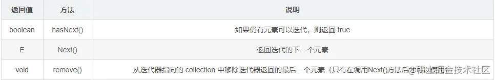 Iterator接口是对Collection进行迭代的迭代器。利用这个接口,可以对Collection中的元素进行访问,实现对集合元素的遍历。 Iterator接口有三个方法:
