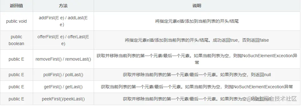 LinkedList类还实现了Deque和Queue接口,实现了这两个接口中的指定的方法,用于处理首部和尾部的元素。可以利用LinkedList实现栈(stack)、队列(queue)、双向队列(double-ended queue )。 它具有方法addFirst()、addLast()、getFirst()、getLast()、removeFirst()、removeLast()等。