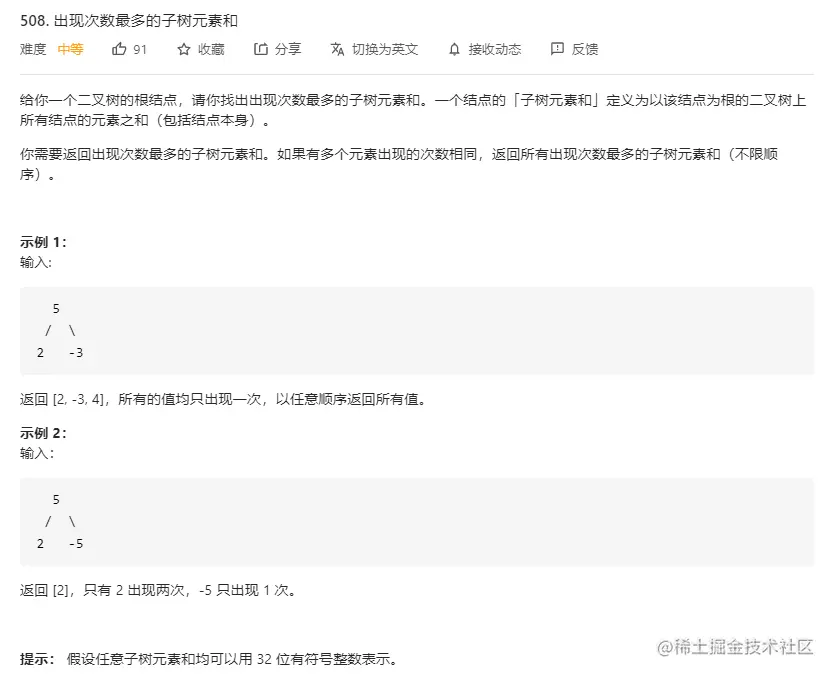 就硬算,直接遍历树,求出所有子树元素和的频率,然后再求出现次数最多的子树元素和。