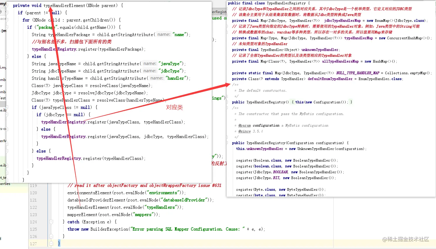 在上图右侧的TypeHandlerRegistry源码中可以看到两个构造方法,会先把Configuration中一些类型映射生成unknownTypeHandler属性,然后对常见的类型映射进行了初始化。