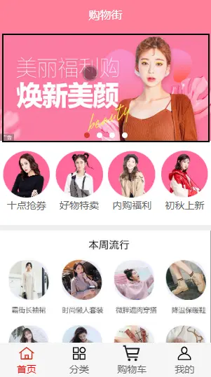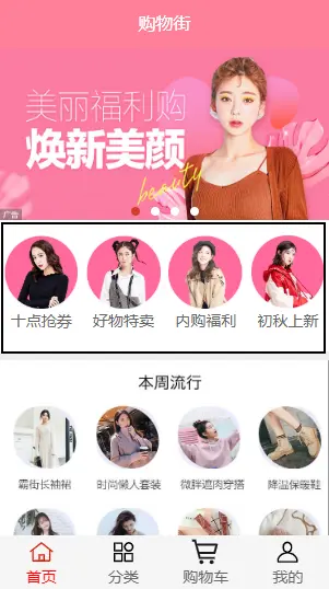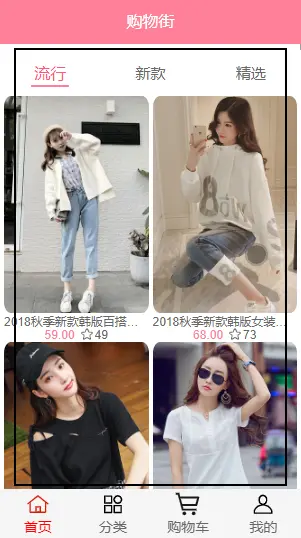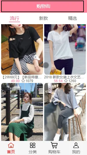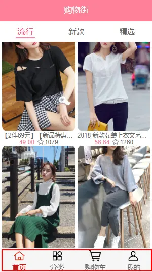 实现点击后标题变色并添加下边框,给标题添加@click点击事件itemClick,传入index参数,默认展示index为0的选项卡,因此设置默认的currentIndex为0,通过index获取当前被点击的标题,把获得到的index赋值给currentIndex,如果当前点击的选项卡的index===currentIndex,就给它动态绑定一个类,该类中实现变色添加下边框。 - 首页商品数据请求