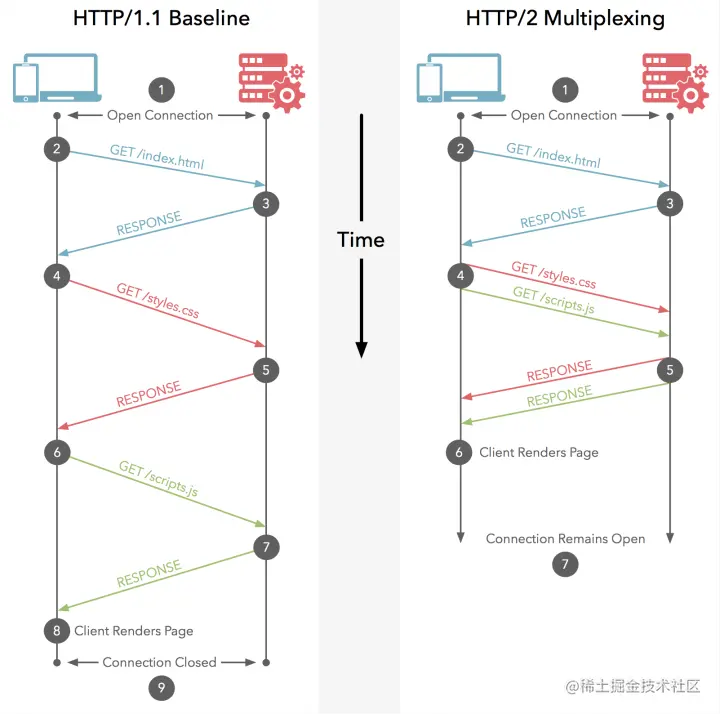- 客户端可以在一个TCP连接中发送多个HTTP请求,这种技术叫做HTTP复用(HTTP Multiplexing)。