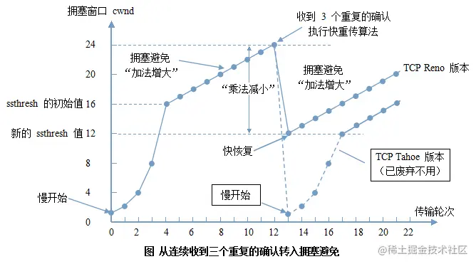 - 快重传是相对于超时重传来说的。因为超时确认引起的数据包丢失,那网络怕是真的拥塞了。那么cwnd将会被初始化为1个报文段,开始慢启动。