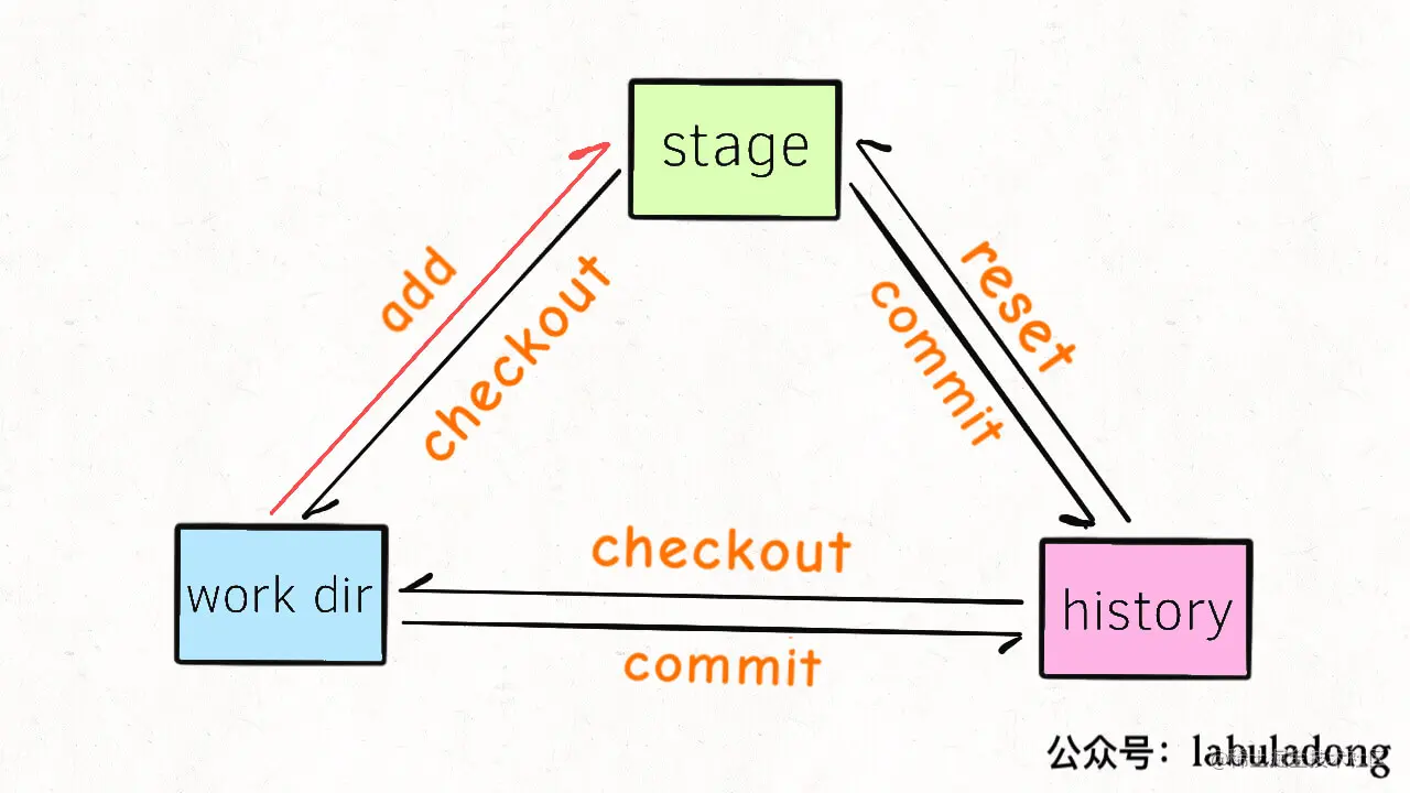 当我们在 work dir 中执行 git add 相关命令后,就会把 work dir 中的修改添加到「暂存区」stage area(或者叫 index area)中去,后文我们称暂存区为 stage