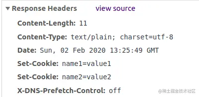 当浏览器访问对应网址时,通过浏览器的开发者工具查看此次 HTTP 通信的细节,可以看见服务器的回应发出了两次 SetCookie 命令: