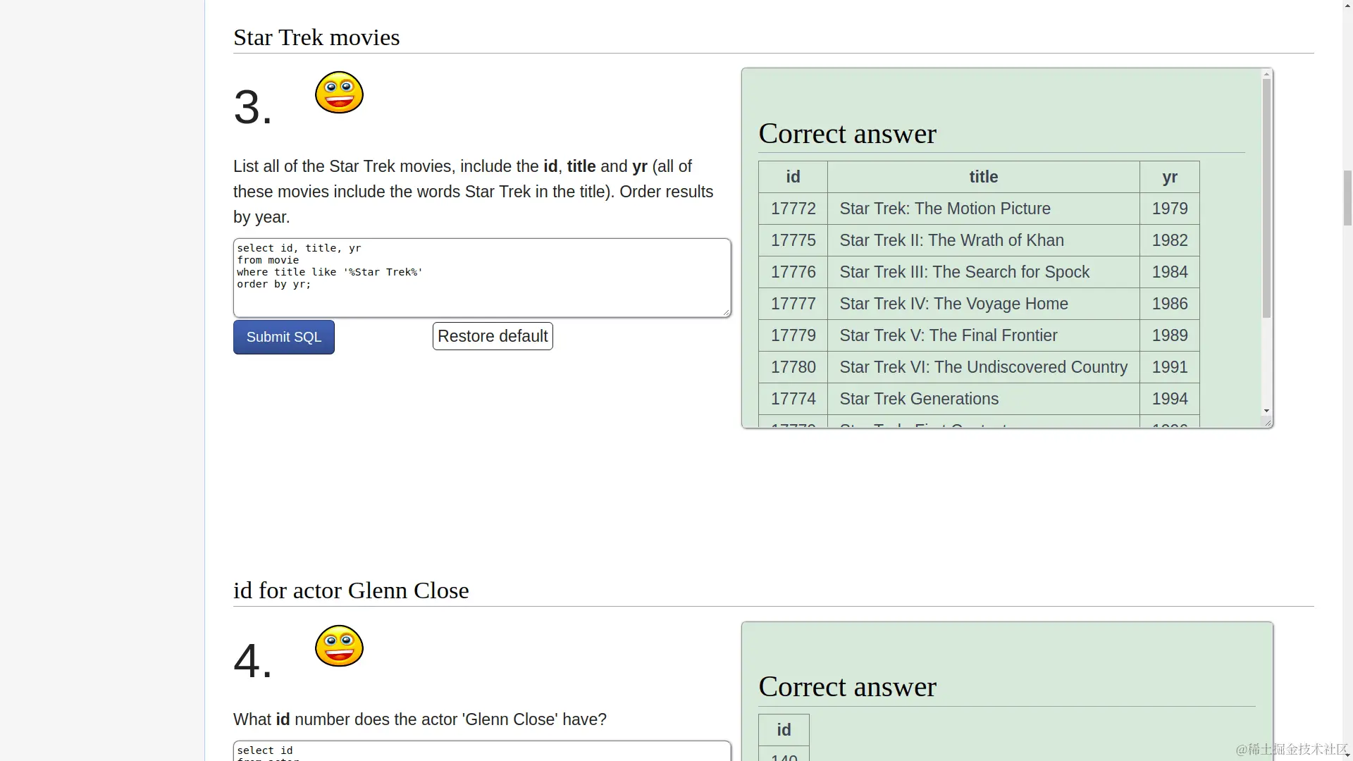 这里都是比较常用的 SQL 命令,给你一个需求,你写 SQL 语句实现正确的查询结果。最重要的是,这里不仅对每个命令的用法有详细解释,每个专题后面还有选择题(quiz),而且有判题系统,甚至有的比较难的题目还有视频讲解: