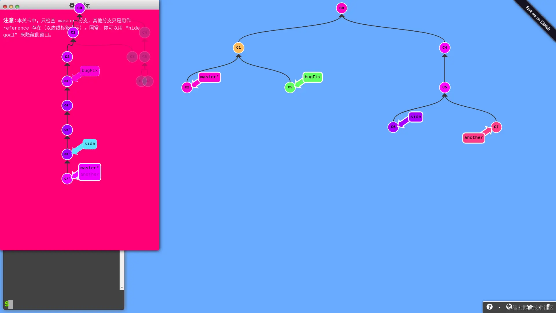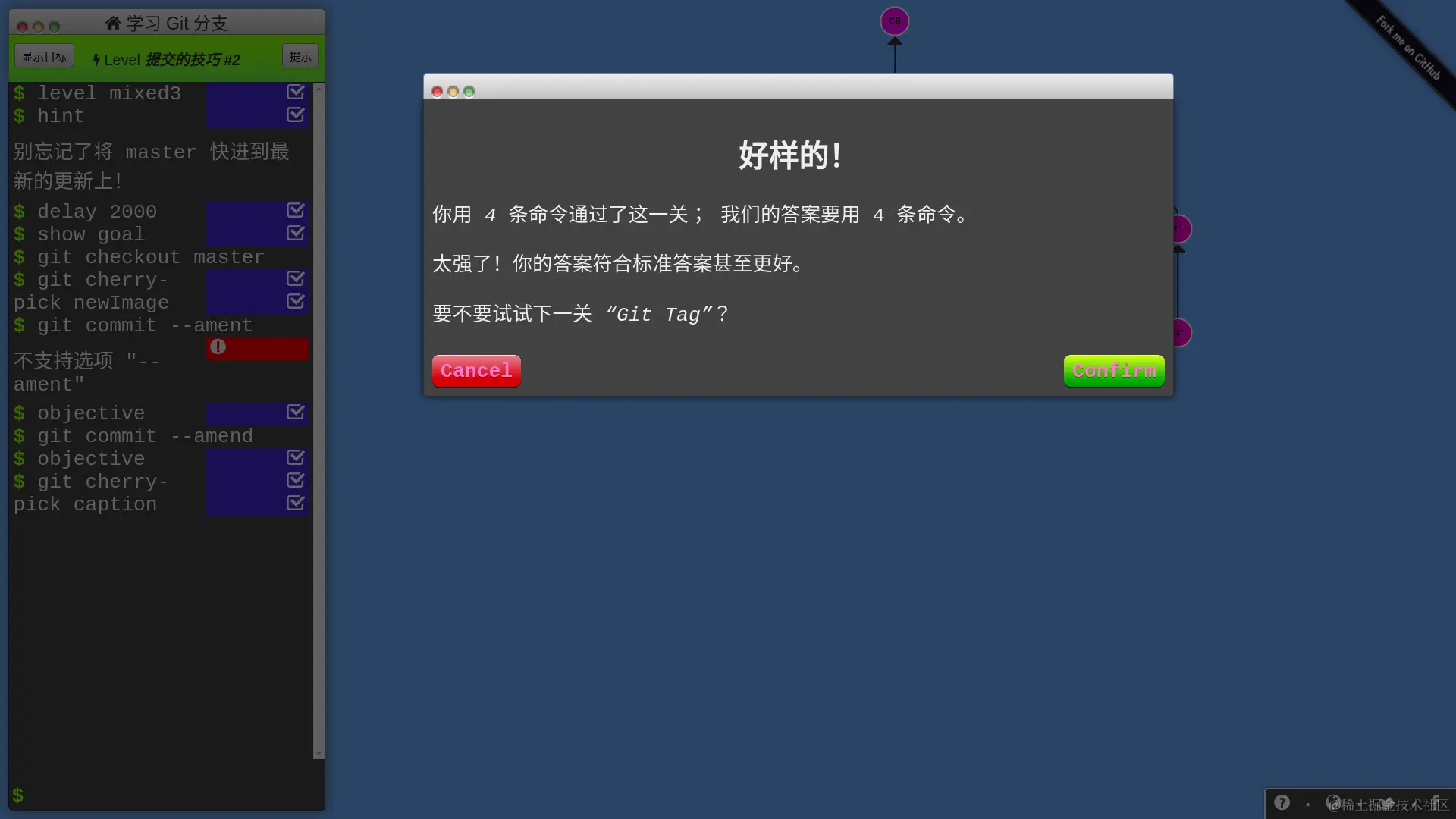 所有 Git 分支都被可视化了,你只要在左侧的命令行输入 Git 命令,分支会进行相应的变化,只要达成任务目标,你就过关啦!网站还会记录你的命令数,试试能不能以最少的命令数过关!