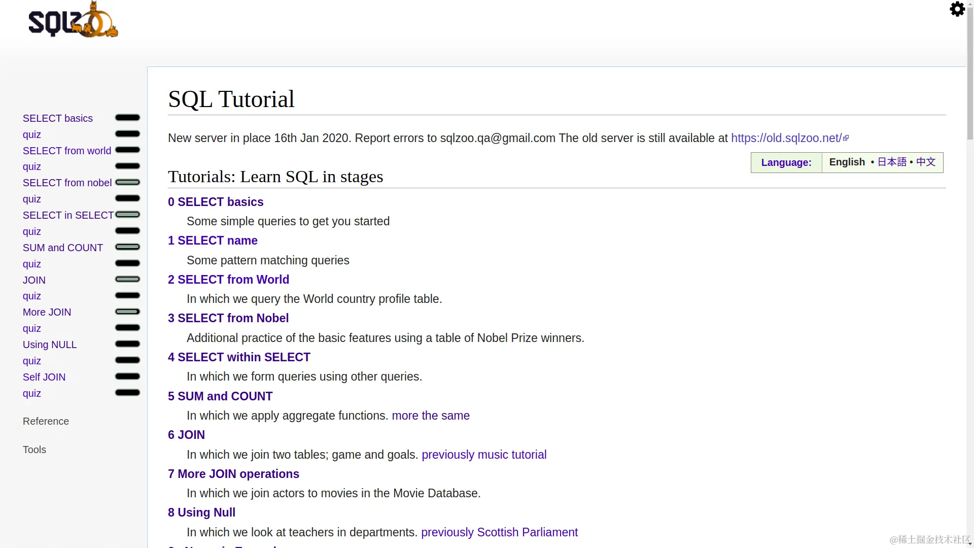 SQLZOO 是一款很好用的 SQL 练习平台,英文不难理解,可以直接看英文版,但是也可以切换繁体中文,比较友好。