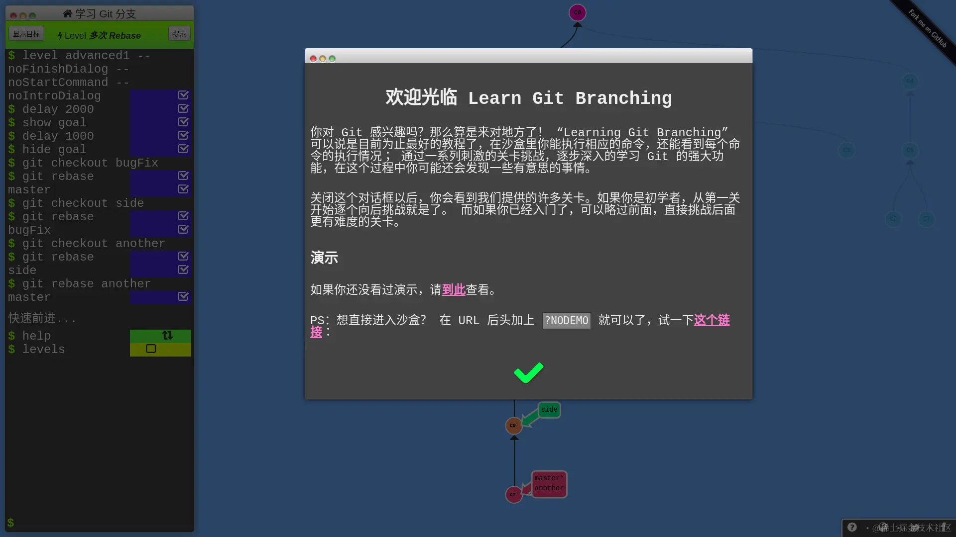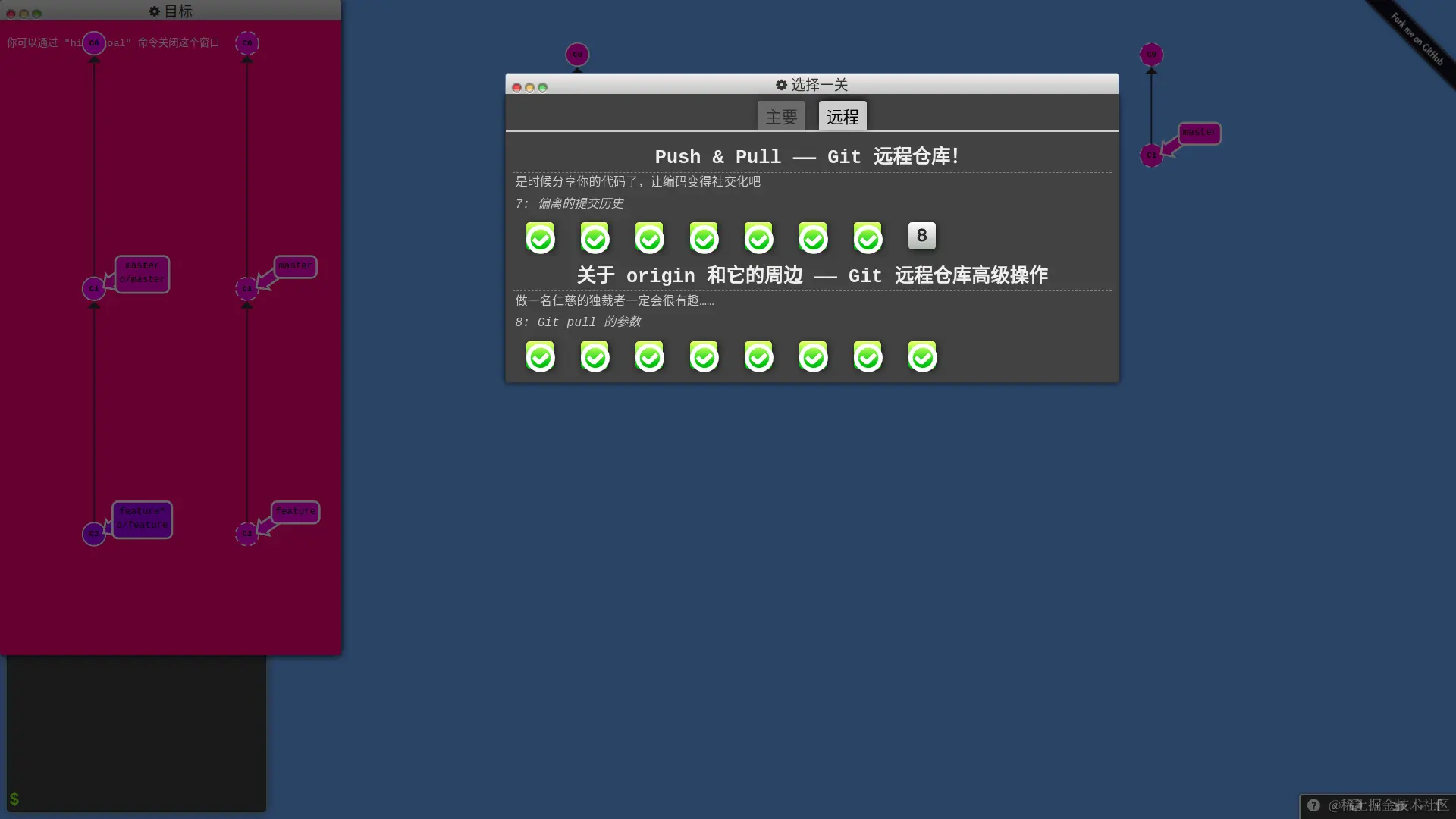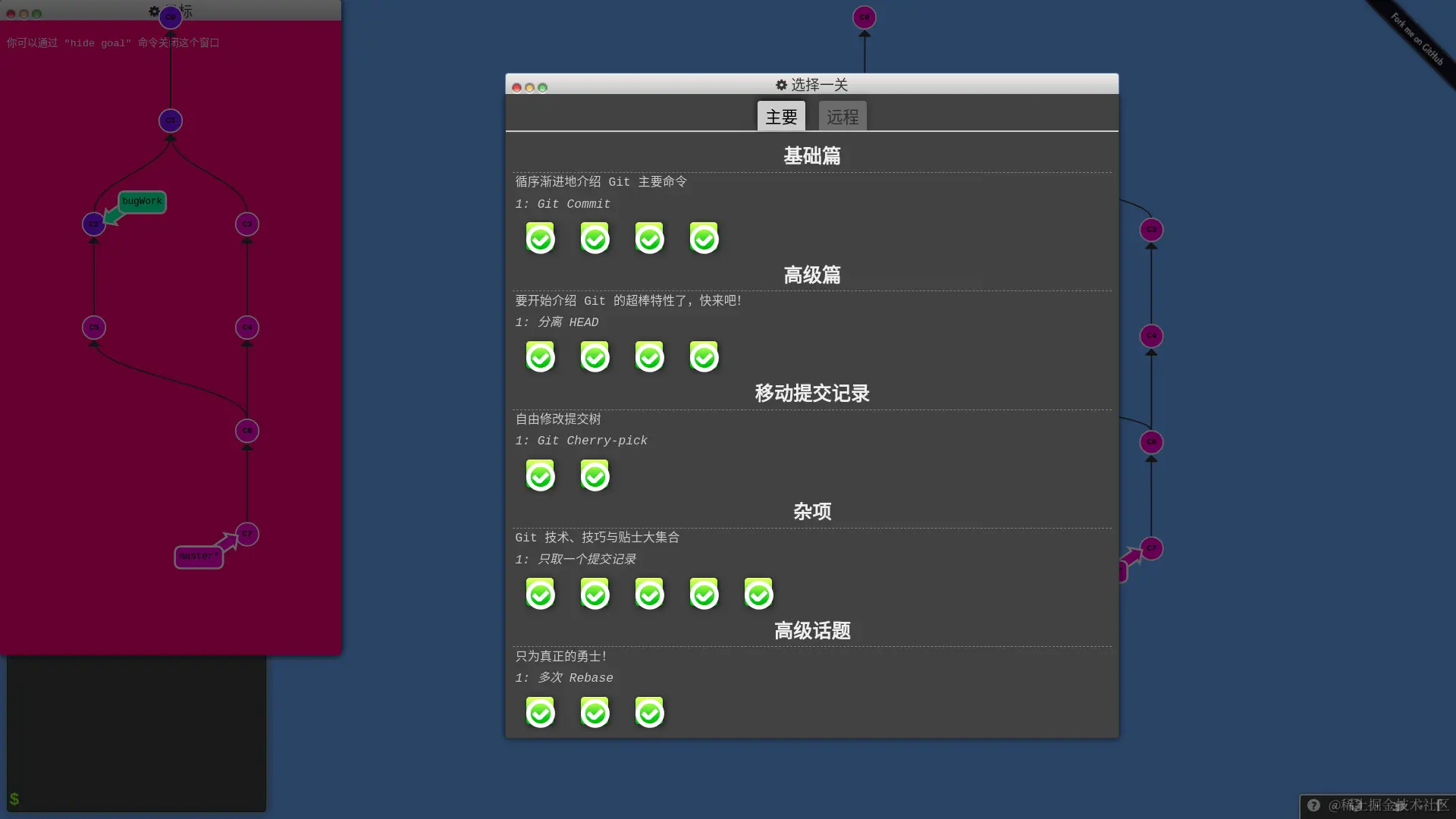 总之,这个教程很适合初学和进阶,如果你觉得自己对 Git 的掌握还不太好,用 Git 命令还是靠碰运气,就可以玩玩这个教程,相信能够让你更熟练地使用 Git。