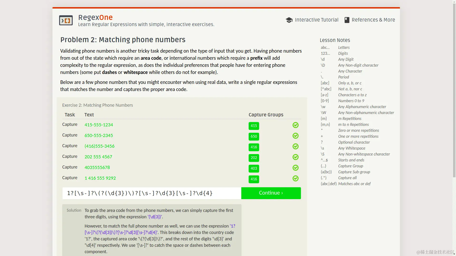 只要写出符合要求的正则表达式,就可以进入下一个问题,关键是每道题还有标准答案,可以点击下面的 solution 按钮查看: