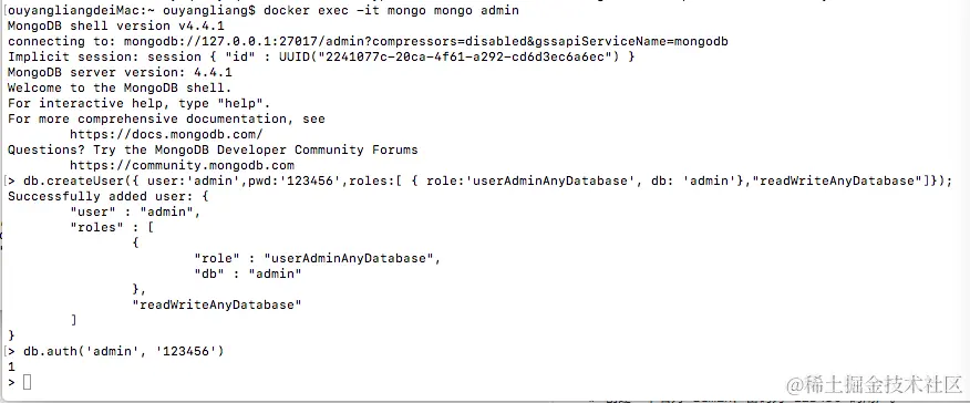 > db.createUser({ user:'admin',pwd:'123456',roles:[ { role:'userAdminAnyDatabase', db: 'admin'},"readWriteAnyDatabase"]});