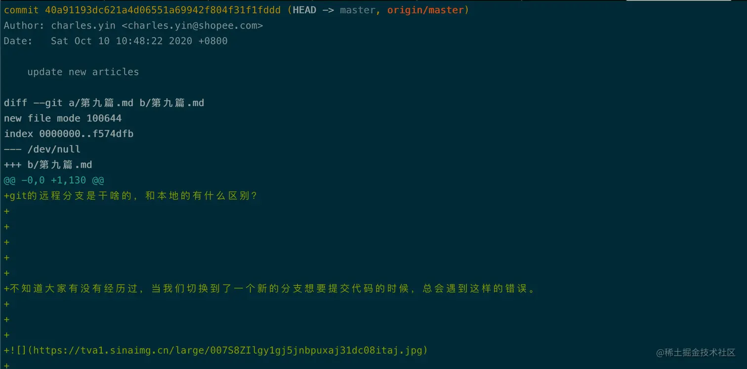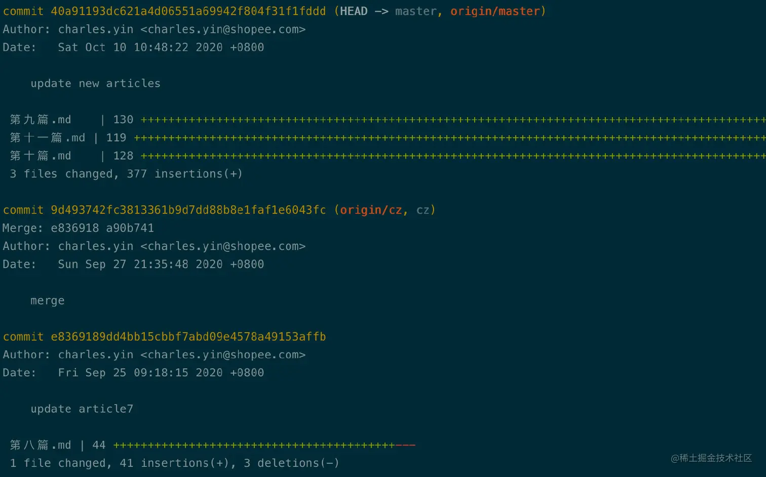 首先来聊聊git show,它解决了我们日常开发场景当中非常常见的一个问题,就是回看某一个提交的内容。我们通过git log只能阅读到commit的时候输入的提示语。但有些开发者不遵守规范,或者是提示语写得非常简略,我们很难get到其中的内容,还是得需要手动checkout过去查看内容,这就非常的不方便。