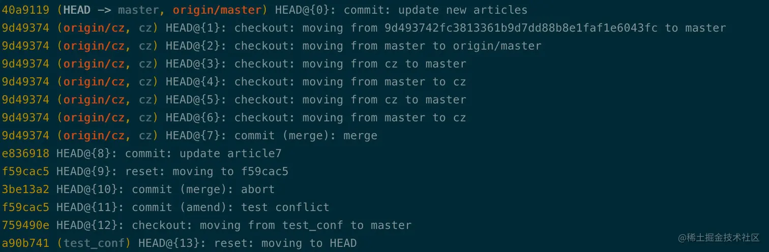 也就是说reflog给了你一次后悔的机会,这也是我们之前说的,只要是提交过的代码,一般情况下都不会丢失,因为我们还可以通过reflog进行查找。