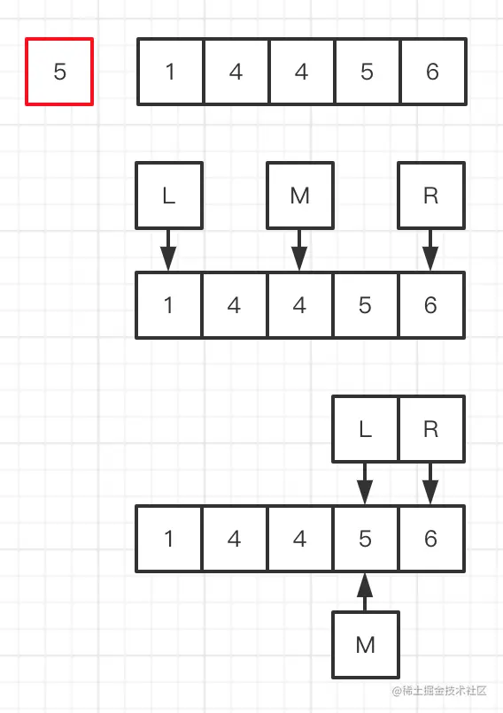 列如:有序递增数组a=[1,4,4,5,6],特定元素是5。L为最左边位置,R为最右边位置,M为[L,R]区间内的中间位置。