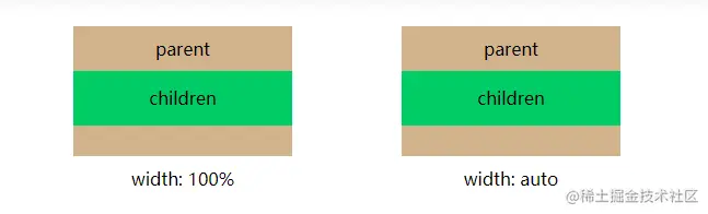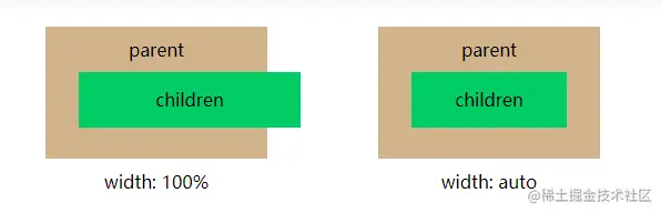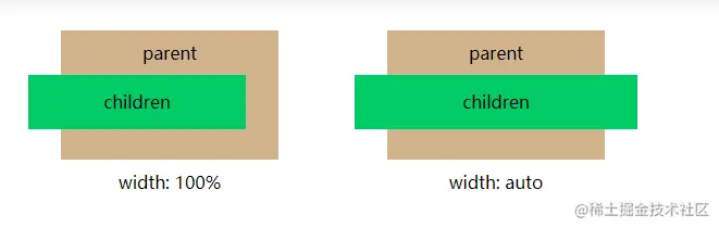 如果设置children元素margin: 0 30px时,width: 100%的元素宽度不变, 位置向左偏移30px;width: auto的元素宽度变化,宽度 = 父元素宽度 - 左边margin - 右边margin, 并且向左偏移30px