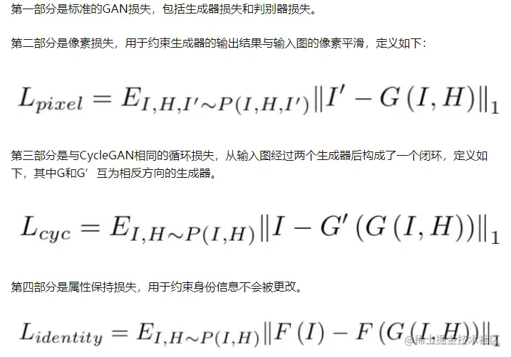GAN变种的损失函数 浮云游子意 2020-11-12 796 阅读1分钟 GAN变种的损失函数 (1)cycleGAN (2)Pix2Pix (3)ExprGAN (4)starGAN (5)StyleGAN 最终, StyleGAN 官方代码采用的损失为 G_logistic_nonsaturating 与 D_logistic_simplegp (6)discoGAN (7)G2GAN
