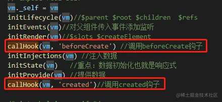 beforeCreate 和 created 的钩⼦调⽤是在 initState 的前后, 在beforeCreate前确立了父子关系和添加事件等操作。initState初始化了 props 、 data 、 methods 、 watch 、 computed 等属性。那么显然 beforeCreate 的钩⼦函数就拿不到这些东西,而created就可以。在这俩个钩⼦函数执⾏的时候,并没有渲染 DOM,所以我们也访问不了DOM。