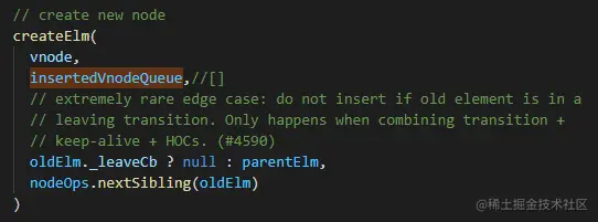 在patch中通过createElm创建节点是传入了insertedVnodeQueue空数组。