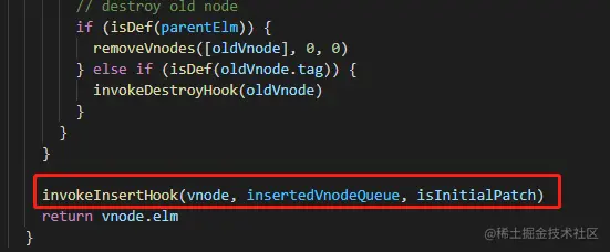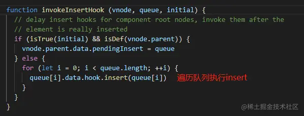 在patch函数最后执行了invokeInsertHook函数,函数遍历insertedVnodeQueue数组执行组件的insert钩子。