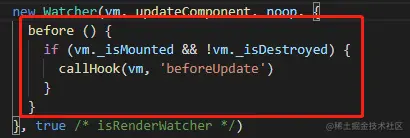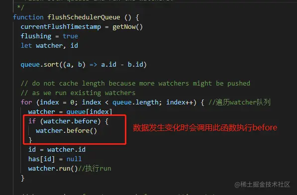 在组件挂载时创建了组件的渲染Watcher,beforeUpdate 的执⾏时机是在渲染 Watcher 的 before函数,这⾥有个判断,在组件已经 mounted 并且组件没有destroyed,才会去调⽤这个钩⼦函数。flushSchedulerQueue是在我们修改了值触发了setter,将值订阅的watcher丢入队列中最后遍历执行watcher.before()。
