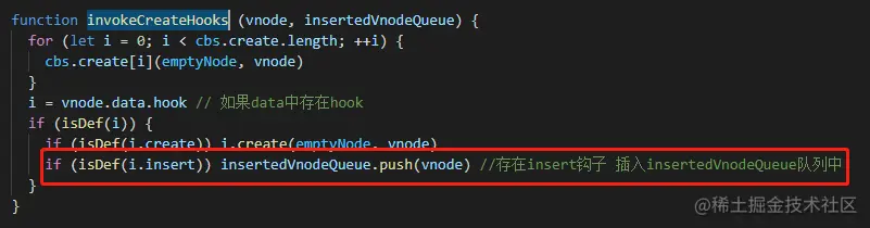 这里判断data中是否存在hook,如果存在并且存在insert钩子,则把当前的组件vnode插入到insertedVnodeQueue数组中。