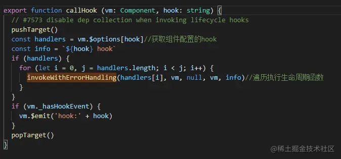 根据传⼊的字符串 hook ,去拿到 vm.$options[hook] 对应的回调函数数组,然后遍历执⾏,执⾏的时候把 vm 作为函数执⾏的上下⽂。