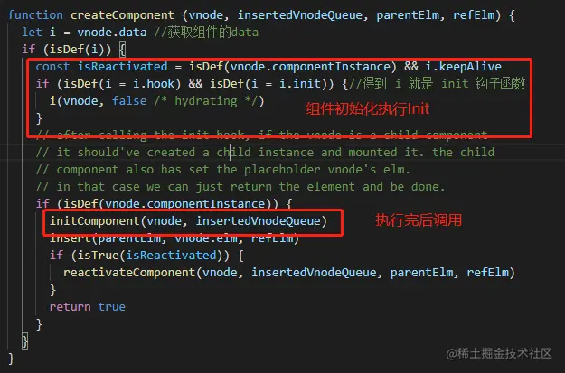 - createElm:如果遇见组件标签则创建组件初始化组件