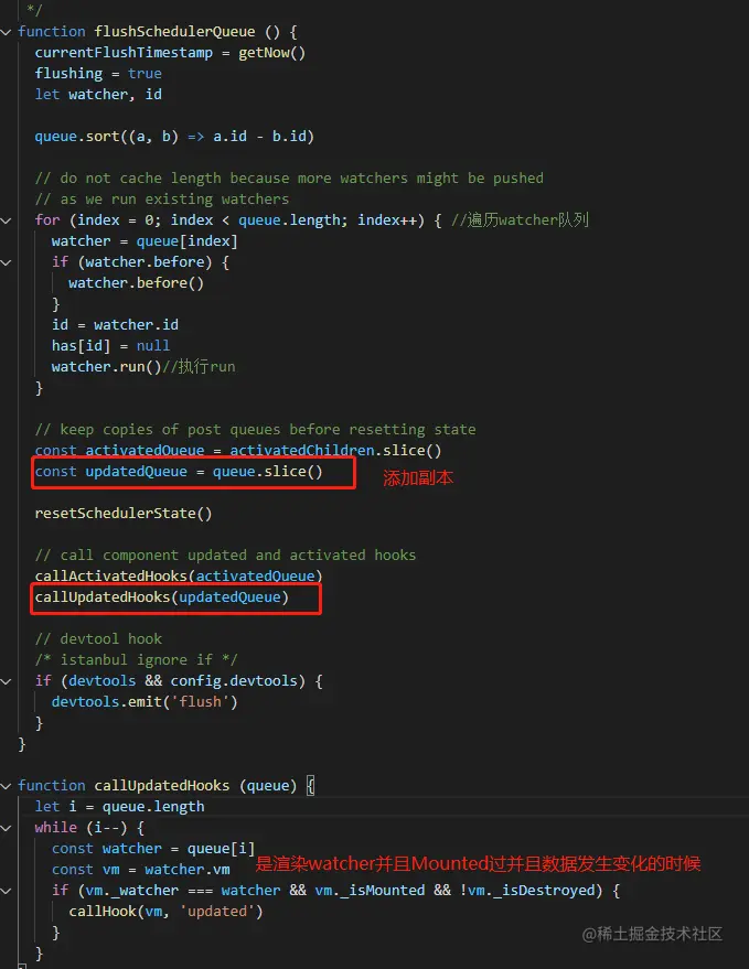 update 的执⾏时机是在 flushSchedulerQueue 函数调⽤的时候,updatedQueu是wathcer 数组的拷贝副本,在 callUpdatedHooks 函数中,它对这些watcher进行遍历,只有满⾜当前 watcher 为渲染watcher以及组件已经 mounted并且组件没有destoryed 这三个条件,才会执⾏ updated 钩⼦函数。