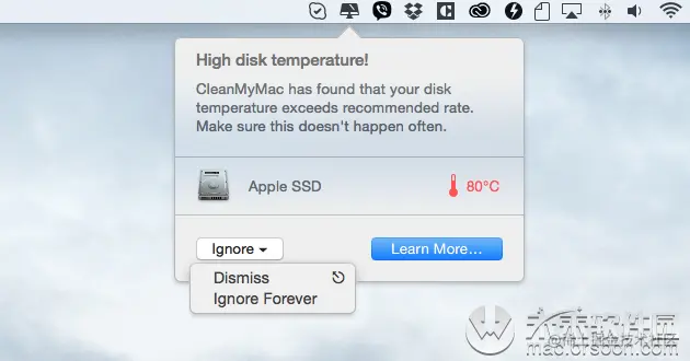 推荐使用CleanMyMac X这样的应用程序,该应用程序具有许多用户友好的工具,可以使Mac保持最佳性能。对于Mac过热的问题,CleanMyMac X允许您检查硬盘驱动器的温度,甚至可以设置智能健康状况警报(用于高温)以自动监视Mac的温度,并在出现问题时通知您。