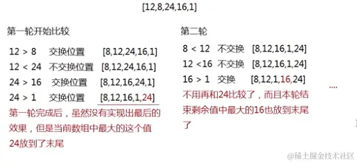 核心思想:让数组中的当前项和后一项进行比较,如果当前项比后一项大,则两项交换位置(让大的靠后)即可。