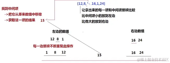 - 让拿出来的每一项和中间项继续比较,比中间项小的放左边,比中间项大的放右边