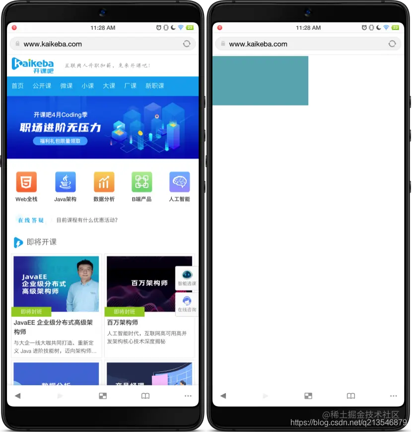 先来思考一个问题,如果想要像右边手机上那样,在页面中显示一个宽度为屏幕宽度50%的色块,应该怎么做? 这个我估计大家都知道,写个div,宽度50%不就好了?