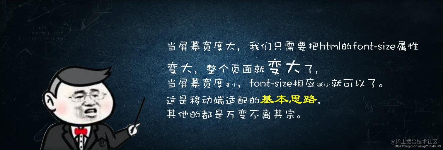 我们正是利用这一点,让页面在不同宽度的手机上进行放大缩小,从而达到适配的目的的。当屏幕宽度大,我们只需要把html的font-size属性变大,整个页面就变大了,当屏幕宽度变小,font-size相应减小就可以了。这是移动端适配的基本思路,其他的都是万变不离其宗。