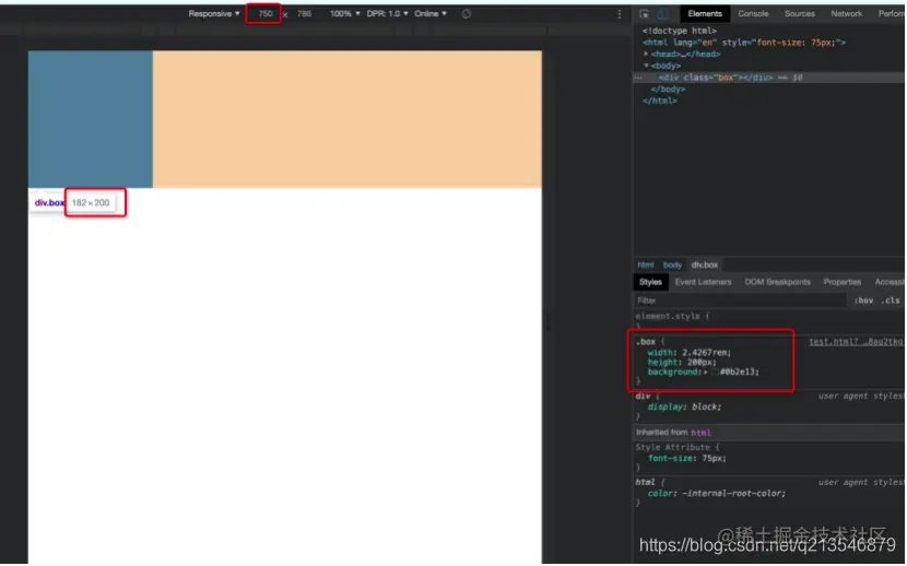 可以看到box的宽度还是207没变,但是它已经占据屏幕宽度的一大半了,但是我们要的效果是box依然只占屏幕宽度的一半怎么办?那就再次修改html的font-size咯。