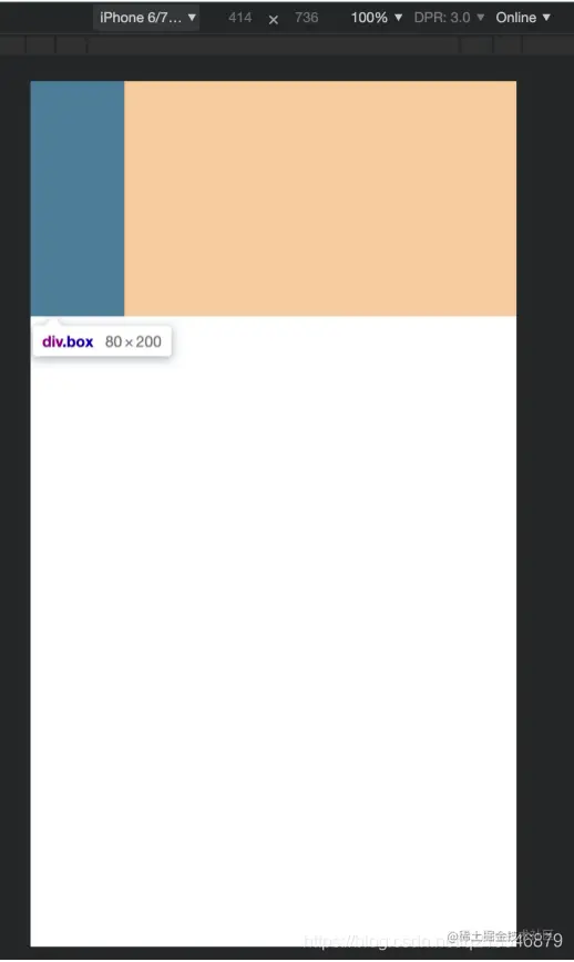 现在我用了浏览器里的模拟器,模拟iPhone6 Plus,这个手机的屏幕宽度时414px。然后我们知道文字大小在没有设置的情况下一般是16px 所以现在的box宽度是80,上图能看到