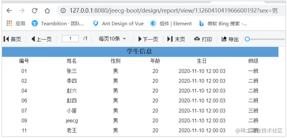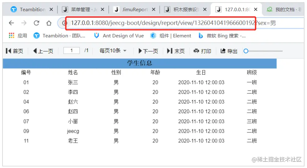 4、预览的时候,需要在浏览器中输入参数为“?sex=1”这种格式,如果多个请求我们用“?sex=1&name=2”。如这个例子“?sex=男”;