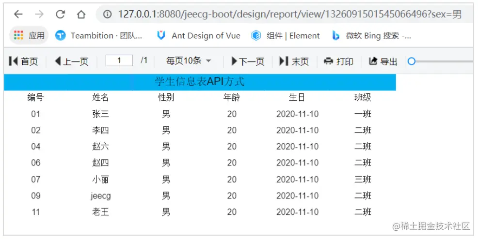 6、 预览的时候,需要在浏览器中输入参数为“?sex=1”这种格式,如果多个请求我们用“?sex=1&name=2”。如这个例子“?sex=男”;