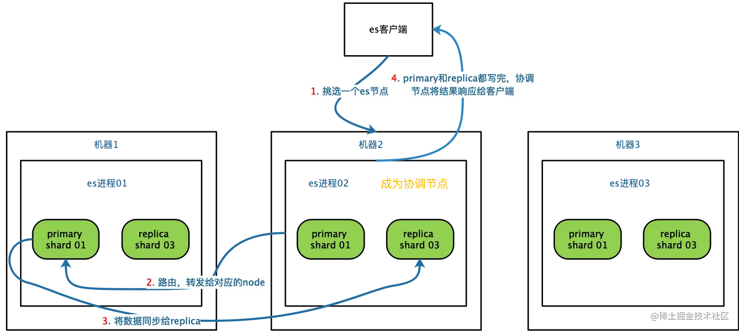 - 实际的node上的primary shard处理请求,然后将数据同步到replica node