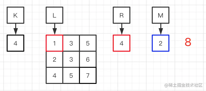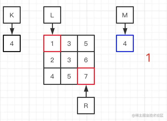 步骤1计算出S等于2,刚好跟K相等,M的值与数组中的也刚好相等,如果M-1的话R就等于2,然后最终结果就变成2。假如矩阵中有多个相同的值,S有可能大于K,M与要求的数相等,也会出现最后错误答案。L能加1的原因是,L的S个数比K要少,所以+1有可能变成S==K,直到L==R。