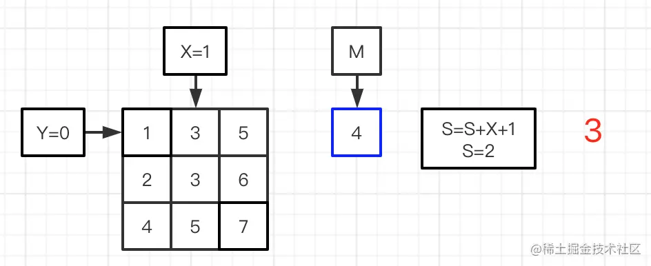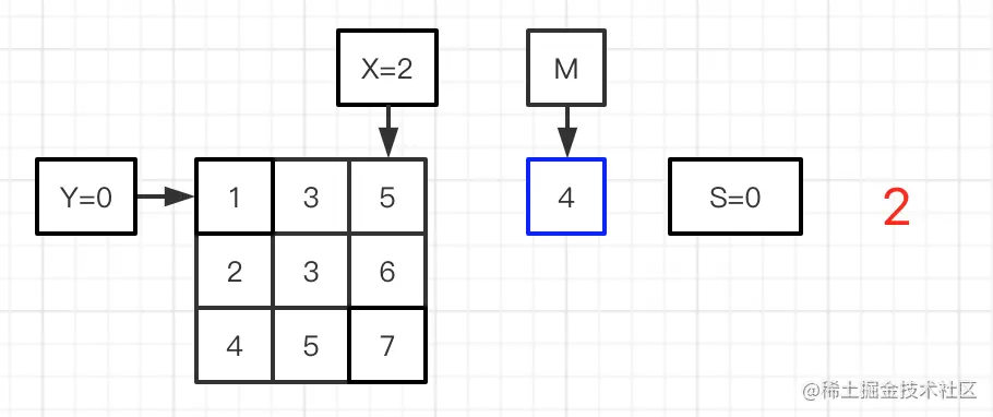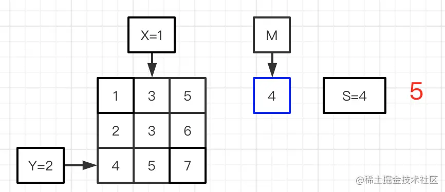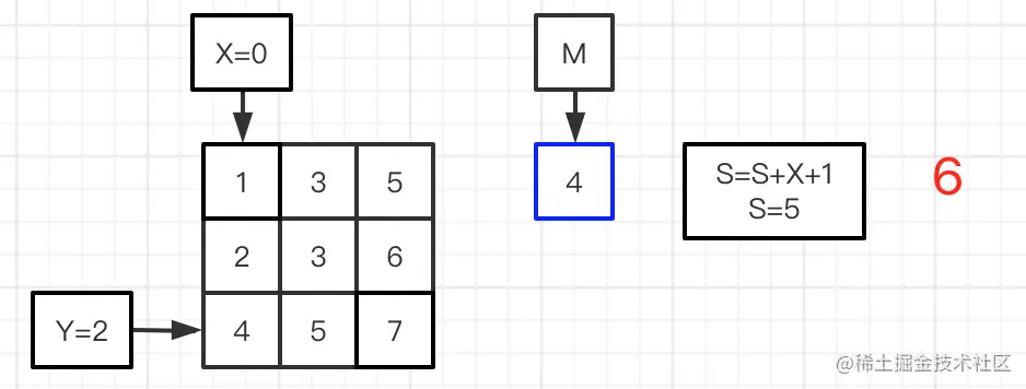 图二到六:进行平均值M与矩阵的数值做对比,图二的matrix[Y][X]=5比M=4大,X=X-1,比较前一位的数值;图三matrix[Y][X]=3比M=4小,则S加上第0行的个数,Y=Y+1,比较下一行;图四matrix[Y][X]=3比M=4小,则S加上第1行的个数,Y=Y+1,比较下一行;图五matrix[Y][X]=5比M=4大,X=X-1,比较前一位的数值;图六matrix[Y][X]=4与M=4相等,则S加上第1行的个数;完成矩阵的比较,得到最终的S。