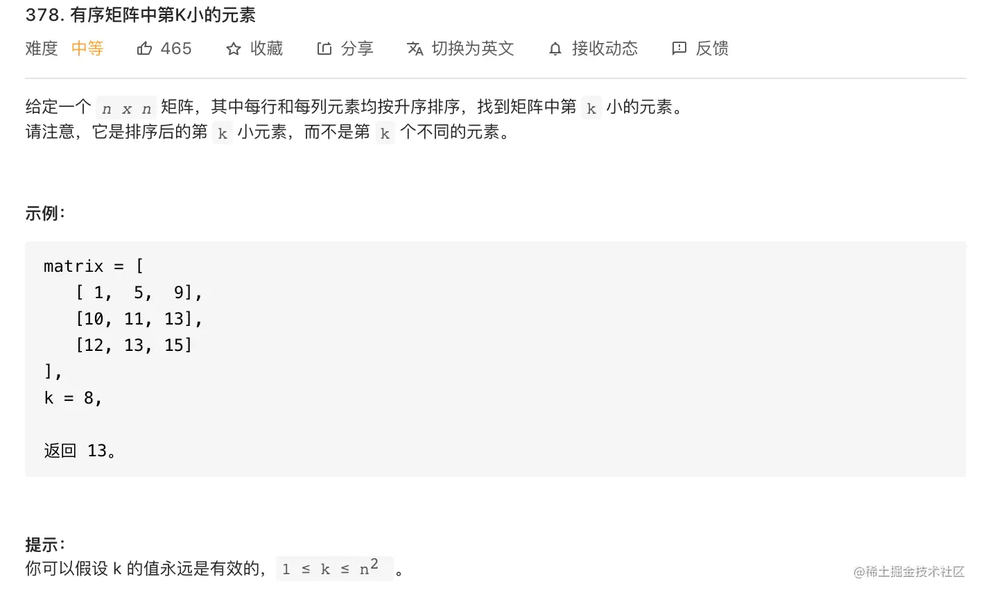 题目大意是给定一个n*n的矩阵,每行从左到右和每列从上到下是递增的序列,找出矩阵中第k小的数。