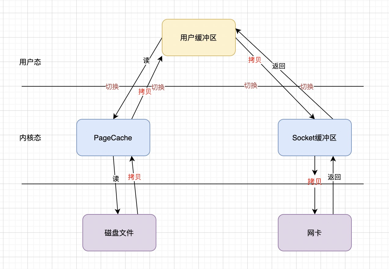 - 四次用户态和内核态的切换:发起读时用户态到内核态的切换、读取结果返回时内核态到用户态的切换;用户缓冲区数据写回到网络时用户态到内核态的切换,写回结果时内核态到用户态的切换。