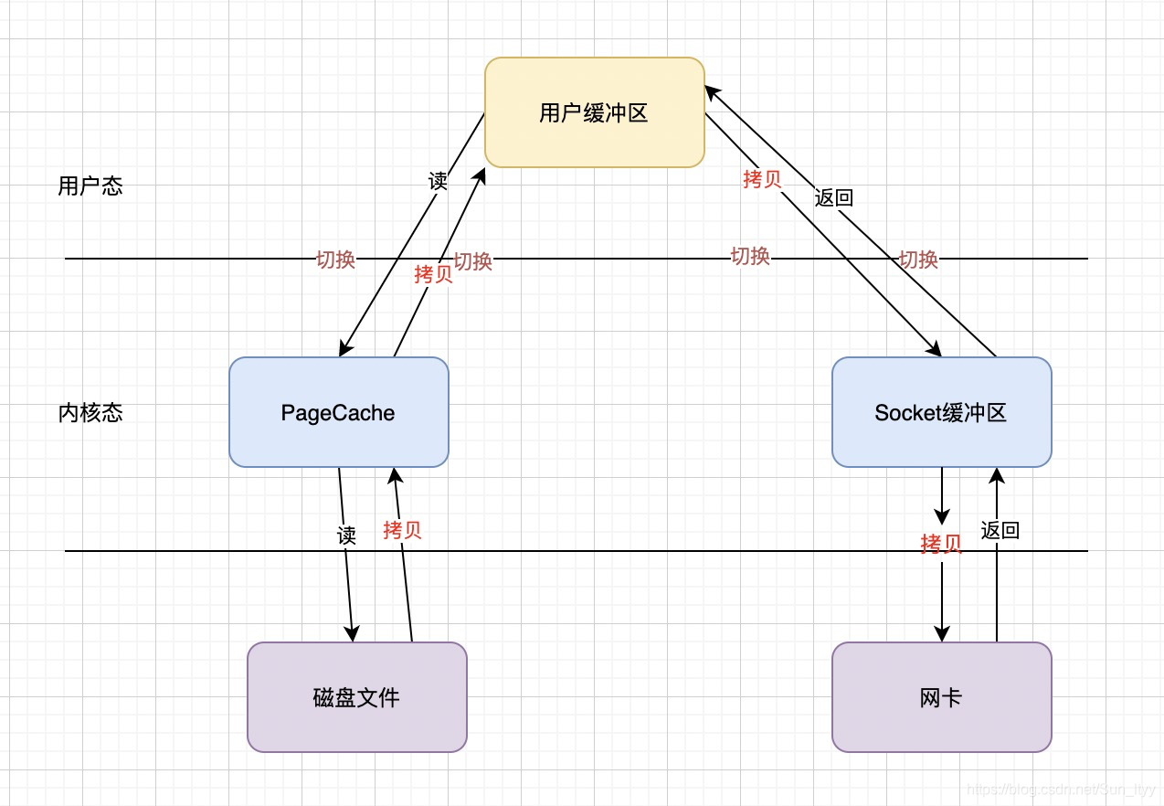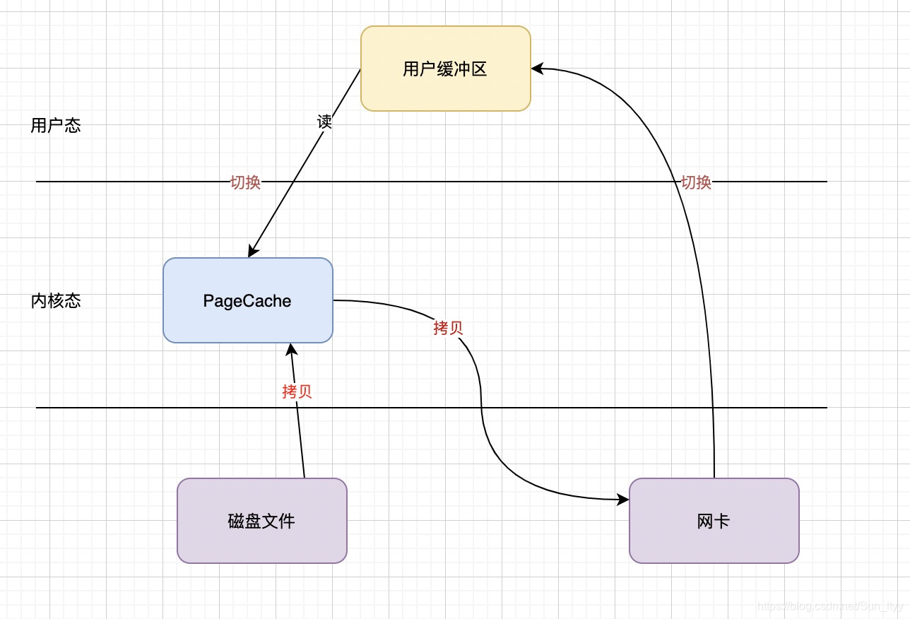 如下图所示:应用开始从磁盘读取一次文件,到发送到网络中,一共需要4次文件拷贝、4次用户态和内核态之间的切换。