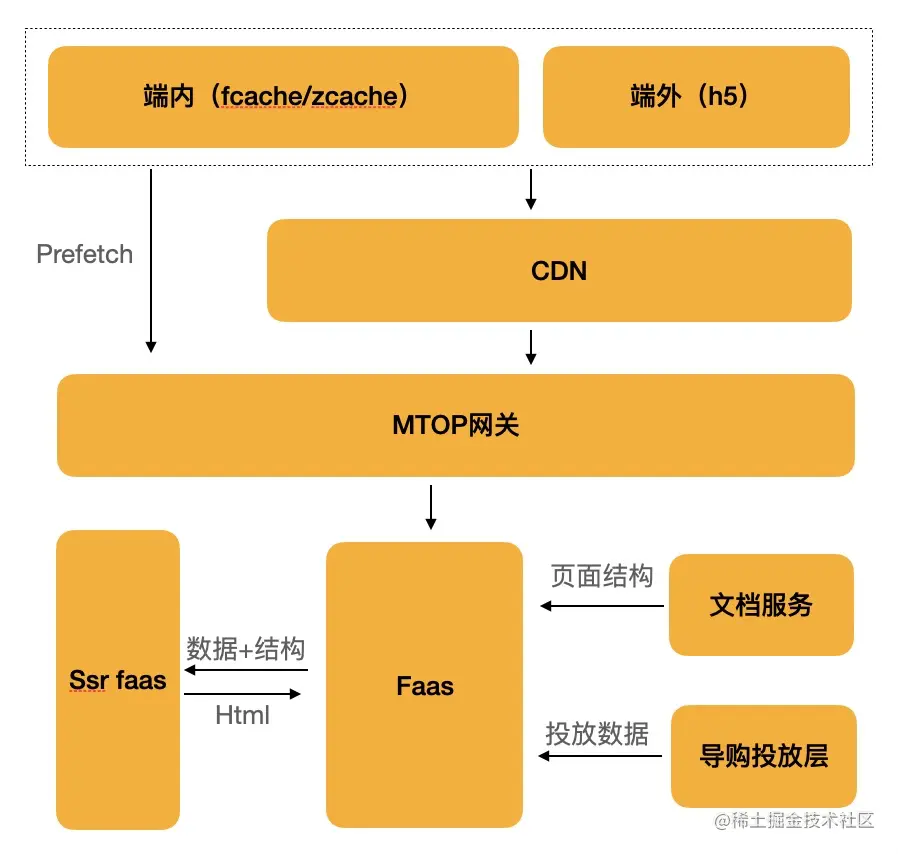 - 优点: 链路改造成本低,模块基本复用,可使用端上现有的离线包、prefetch等优化手段,页面url无变化,走mtop链路无需额外处理数据安全