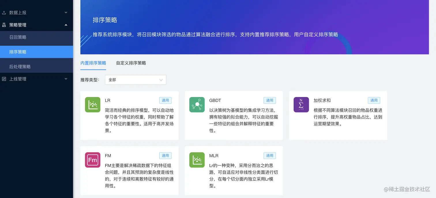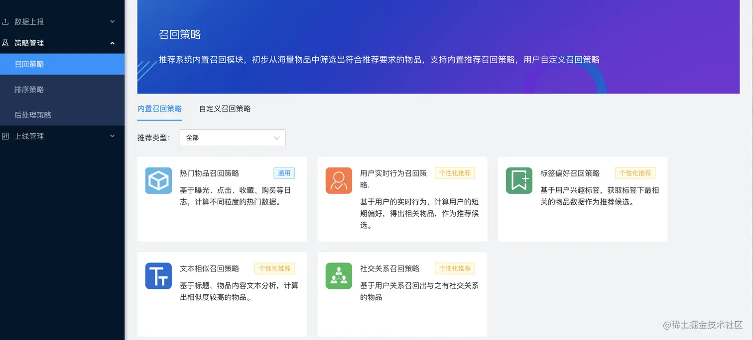 在“策略管理”模块,用户可配置一次推荐结果中,使用的算法及其召回占比,同时支持不同算法召回结果的排序权重,除了算法策略外,系统还预设了多样性、时效性配置和补足策略使用。