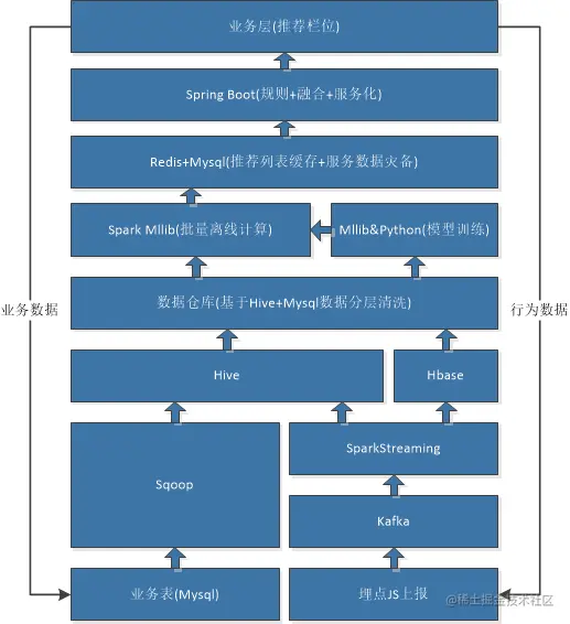 下图是与之对应的实际系统中各个组件的流转过程。需要注意的是生成推荐列表就已经做完了召回和排序的操作,业务层直接调用API就可以得到这个推荐列表。